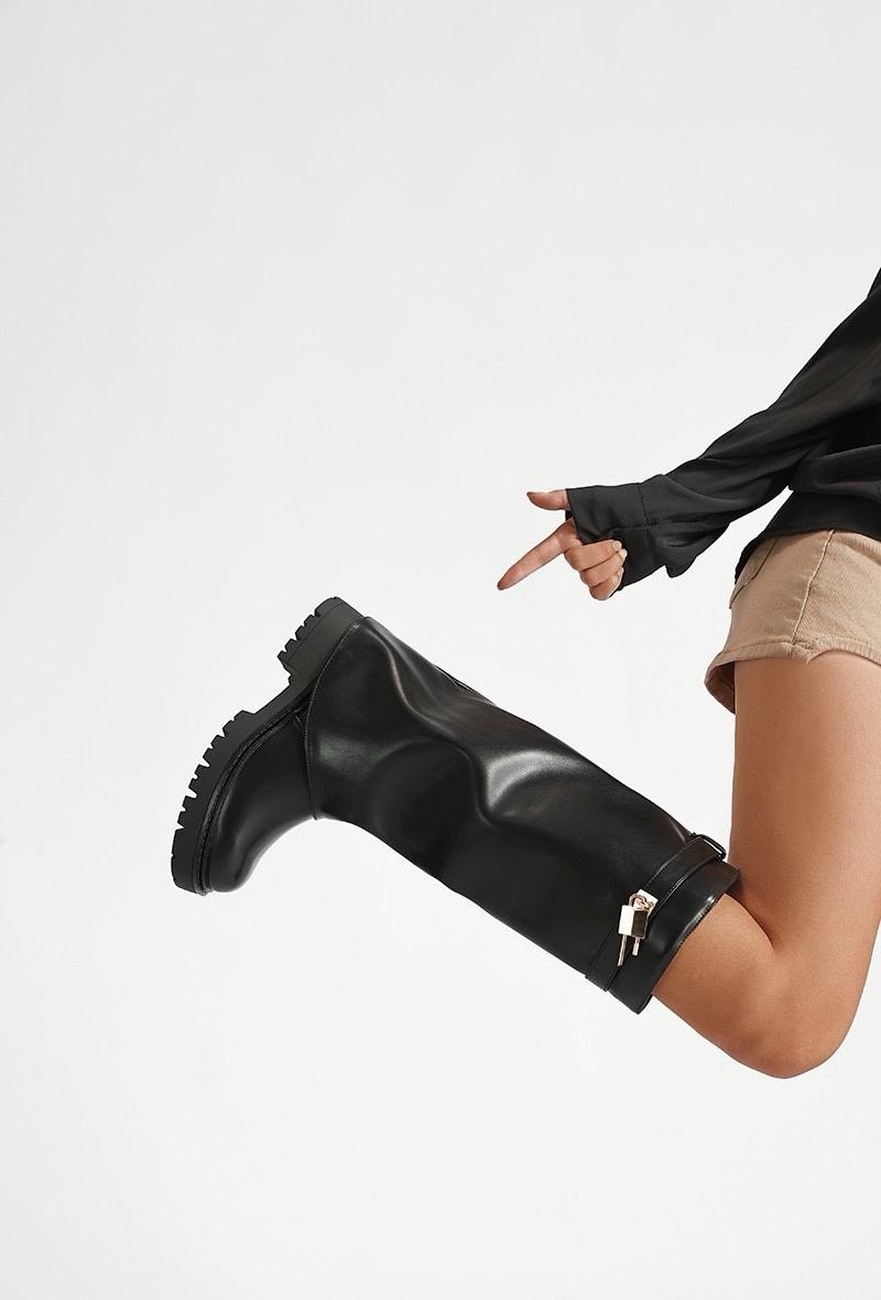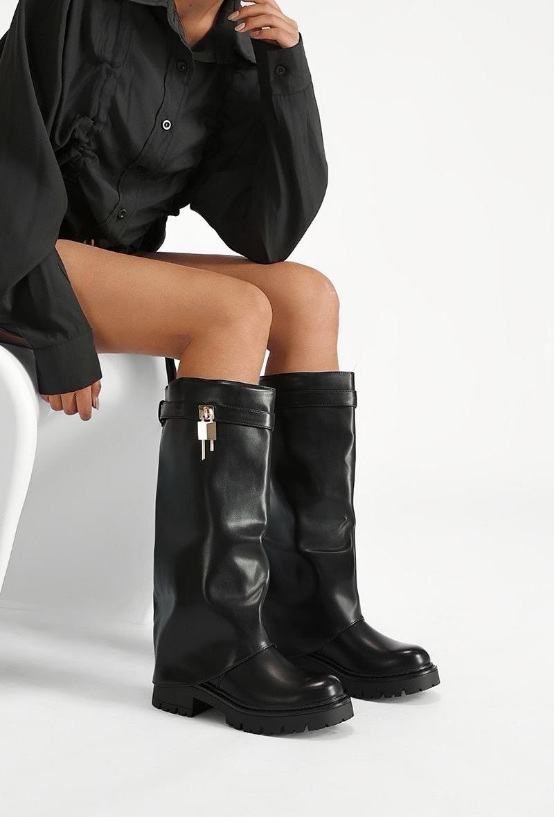 ✨Laissez-vous séduire par les bottes Éclat Noir, une pièce forte qui allie modernité et raffinement. Confectionnées en simili cuir noir de qualité, elles se distinguent par leur détail métallique sophistiqué sur le revers, apportant une touche lumineuse et chic. Leur fermeture éclair intérieure, discrètement intégrée jusqu’à mi-mollet, assure un enfilage facile et un maintien parfait. Montées sur une semelle épaisse et confortable, elles vous accompagnent avec style aussi bien en journée qu’en soirée, pour un look urbain affirmé et intemporel✨