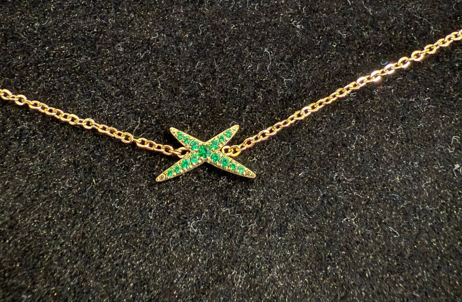 Son pendentif en forme de croix sertie de pierres vertes scintillantes apporte une touche de couleur raffinée tout en conservant un style chic et moderne.