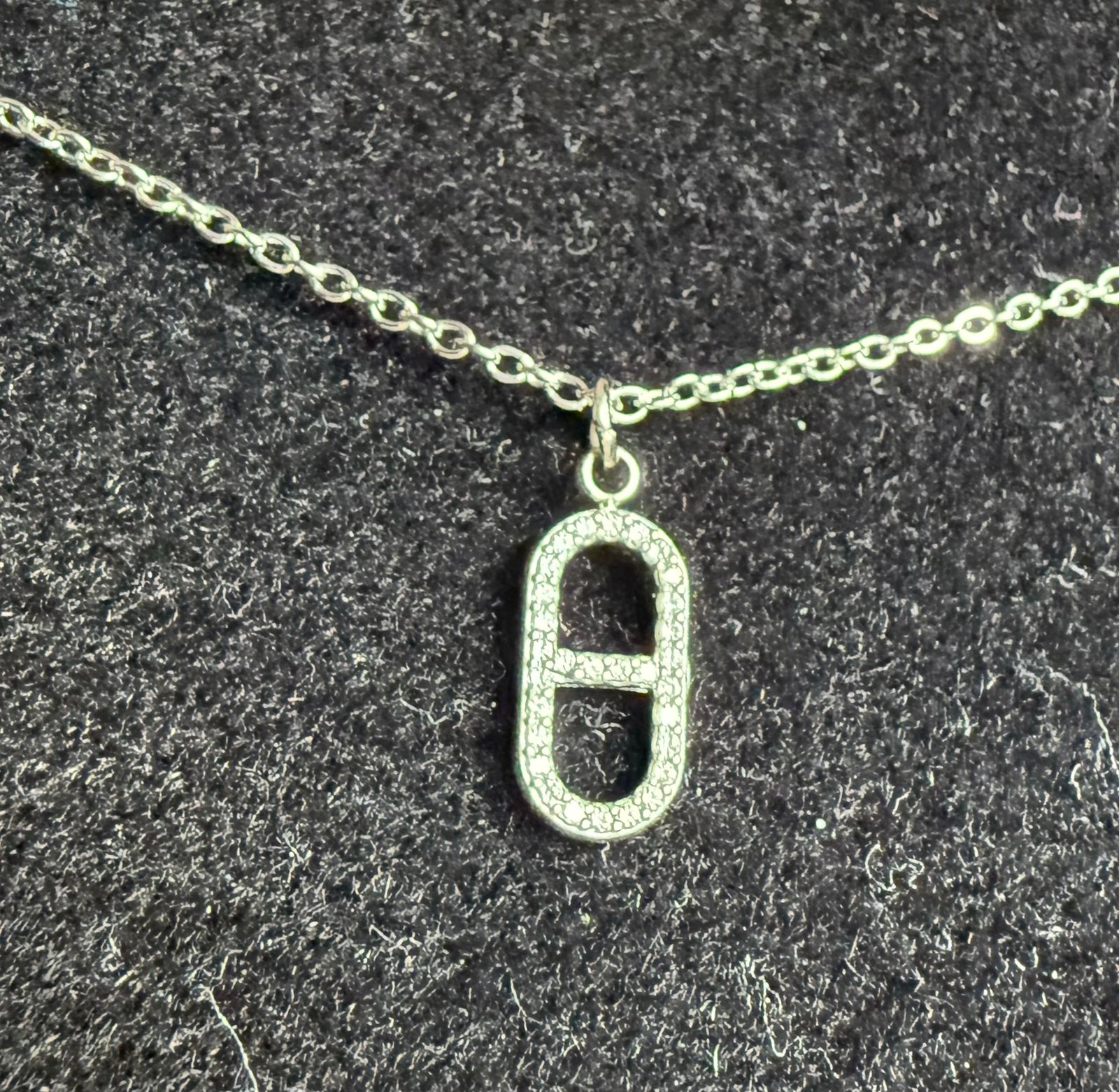 Son pendentif en maille argentée, serti de petites pierres brillantes à l’intérieur, capte subtilement la lumière pour un éclat raffiné et délicat, parfait pour sublimer votre décolleté.
