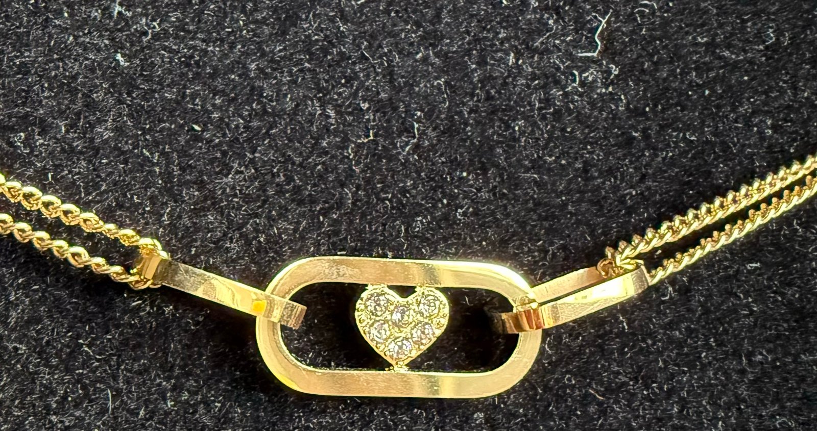 Le pendentif en forme de cœur, orné de petites pierres blanches brillantes et entouré délicatement, capte la lumière à chaque mouvement, apportant une touche d’éclat et de féminité à votre décolleté.