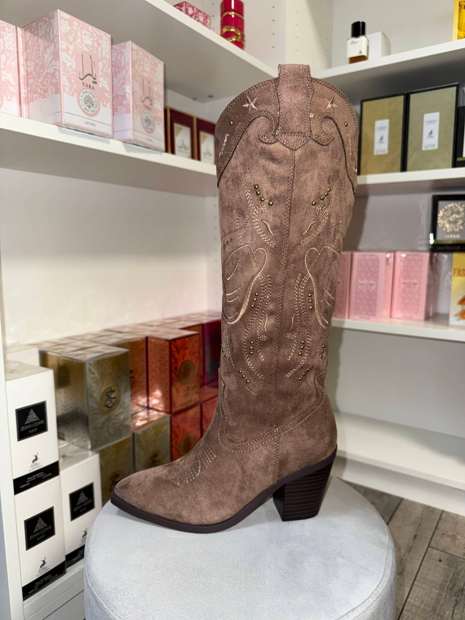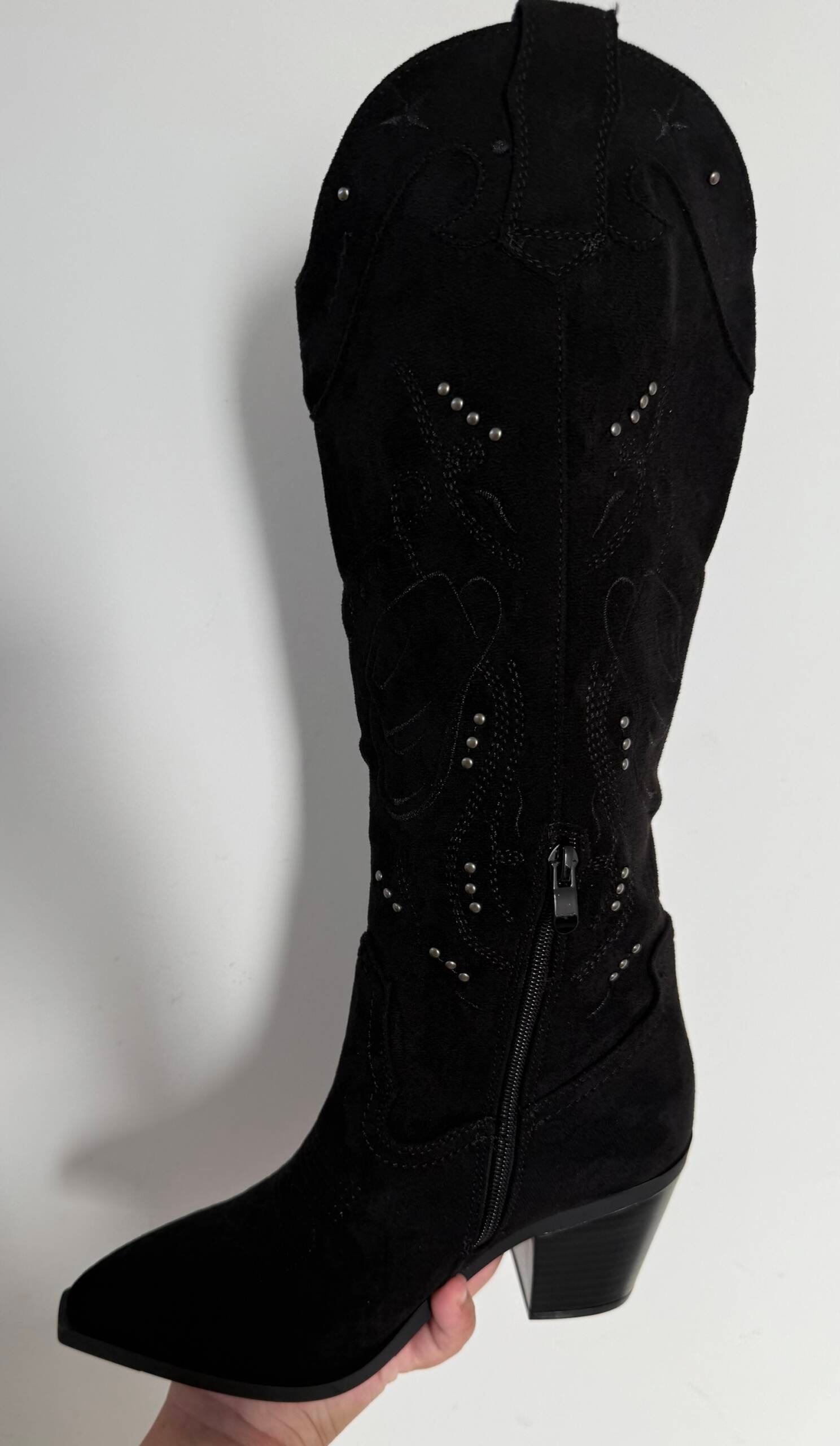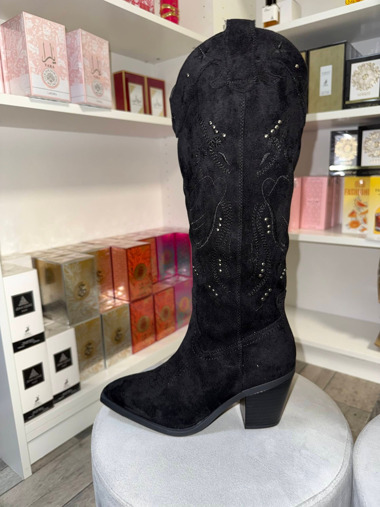 ✨Sublimez vos looks avec ces santiags en daim suédine strasse , alliant style western et raffinement moderne. Leur talon biseauté de 8 cm élance la silhouette tout en restant confortable au quotidien. Grâce à leur fermeture éclair intérieure montant jusqu’au milieu du mollet, elles s’enfilent facilement sans compromettre leur design authentique. Polyvalentes et tendance, ces bottes deviendront vite un incontournable de votre garde-robe✨